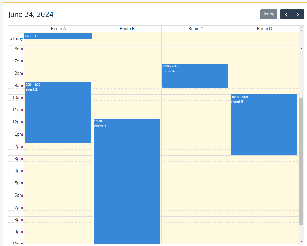 | Day   | Displays the default day and splits the hours into rows to show the events                                                             |