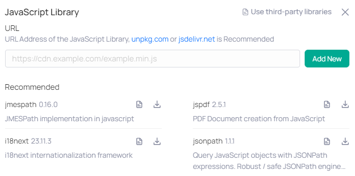 <figure><img src="https://125370873-files.gitbook.io/~/files/v0/b/gitbook-x-prod.appspot.com/o/spaces%2FzdpN2Lz0hzXpnNScDzVt%2Fuploads%2Fgit-blob-aef6773c3c8ec7c0683a38d3b548a19a8f28cf3f%2Fimage%20(248).png?alt=media" alt=""><figcaption><p>Enter a valid URL to the library and add it to the app</p></figcaption></figure>